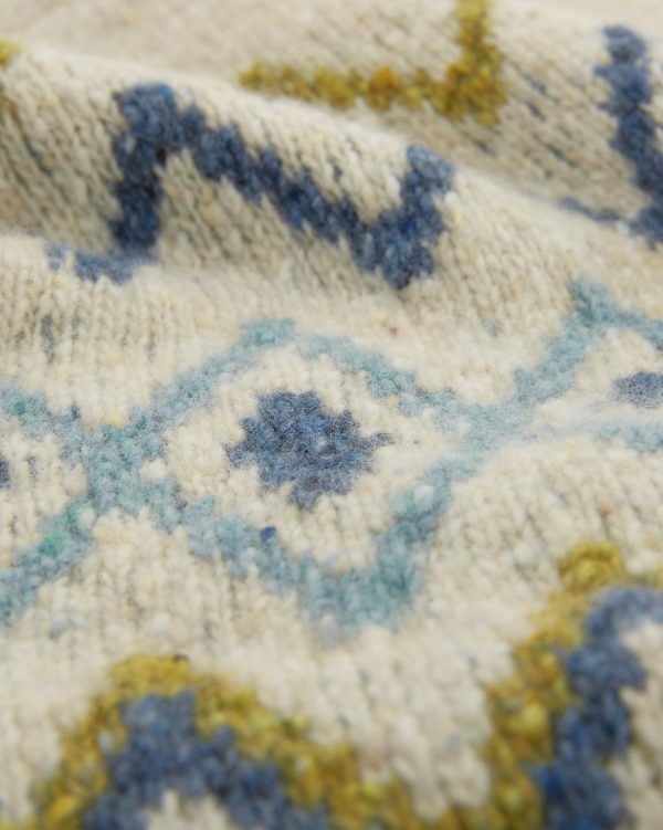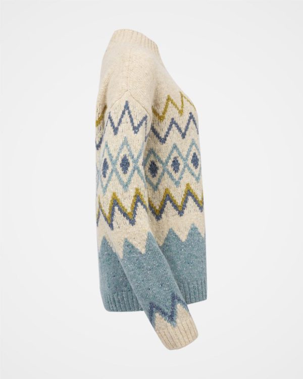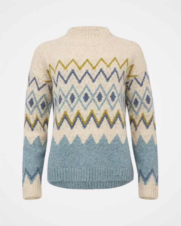 Make a subtle statement in this Donegal wool jumper. The oversized modern zig zag and diamond Fair Isle pattern spans across the body and sleeves, whilst the drop shoulder creates a slouchy, casual shape. The flattering mock neck collar is ribbed, matching the detail at the cuff and hem. Wear with denim for a laid-back look.