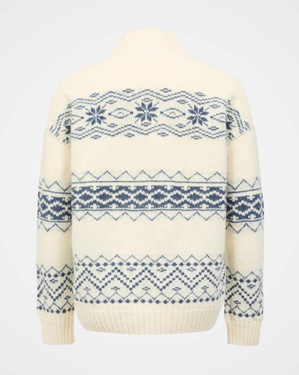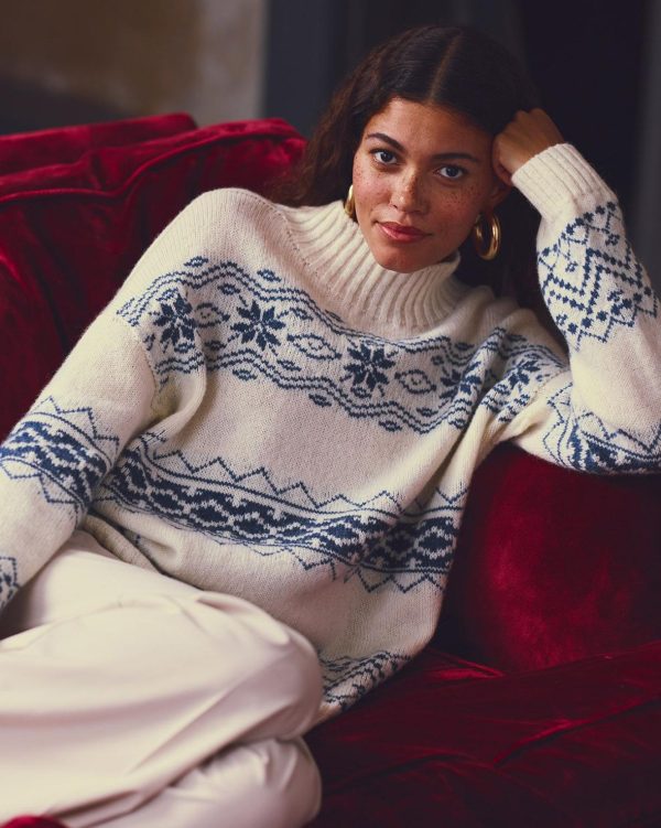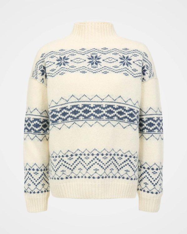 Featuring a funnel neckline and seamless construction with a drop shoulder and boxy fit, this jumper offers quality and comfort. Made in Britain, the wide fair isle stripes across the garment add a pop of pattern and character with a nod to the apres ski trend.