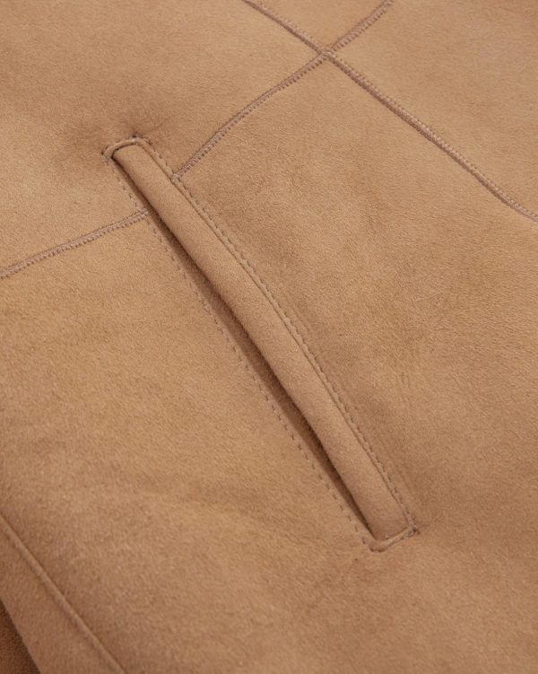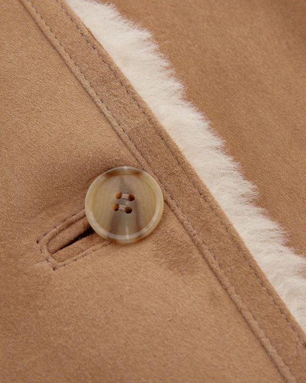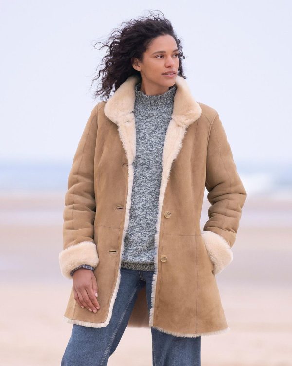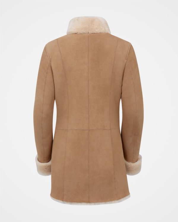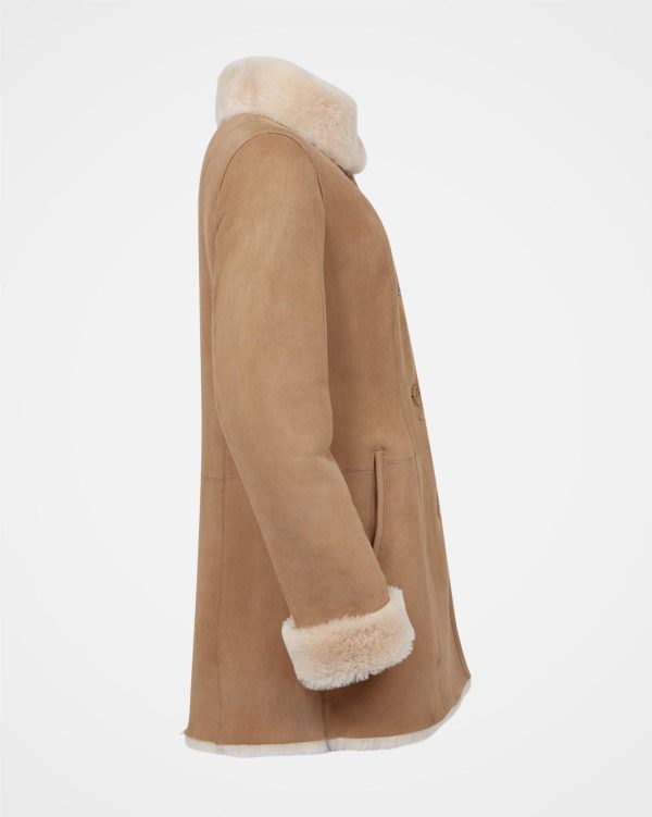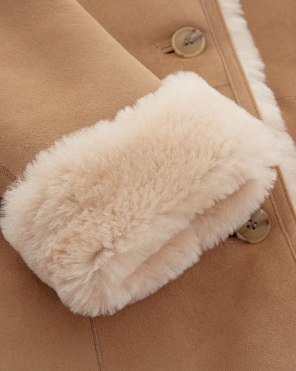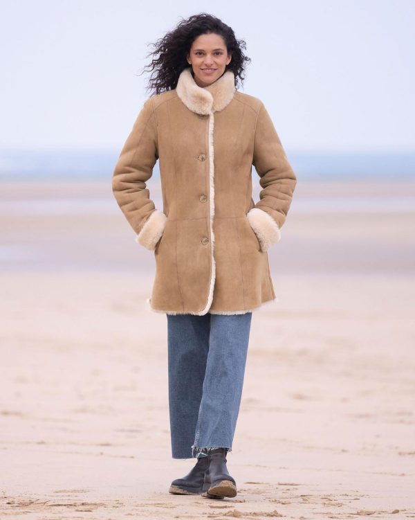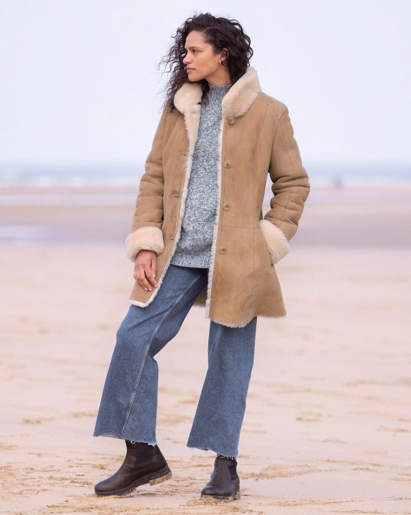 As luxurious as it is warm, this beautiful coat will keep you cosy whilst looking stylish through the depths of winter. A practical funnel collar is crafted from wool, feeling lovely against the skin. The sheepskin of the body has a suede finish on the outside and the inner wool, in a contrast cream, is curly and short but still plush and warm. The edges have been finished allowing for the contrast wool to peek out. Semi-fitted with a relatively straight body, this 3/4 length coat has horn buttons from neck to hem and details include side pockets and purposeful turn-back cuffs.