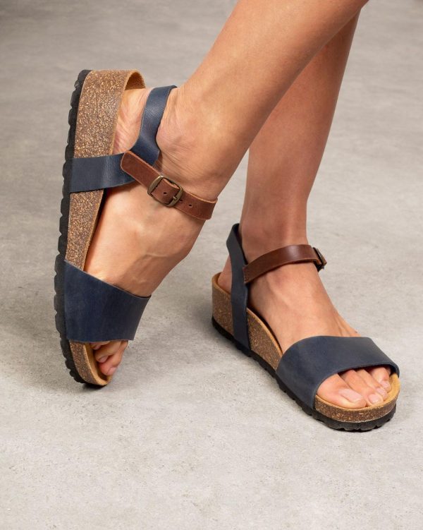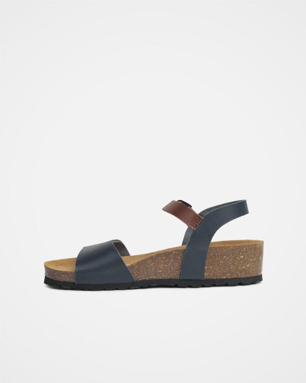 These two-part strap sandals feature a buckled ankle strap and a comfortable low wedge moulded cork sole. With a recycled material outsole, they provide a stylish and considered option for warm-weather outings.