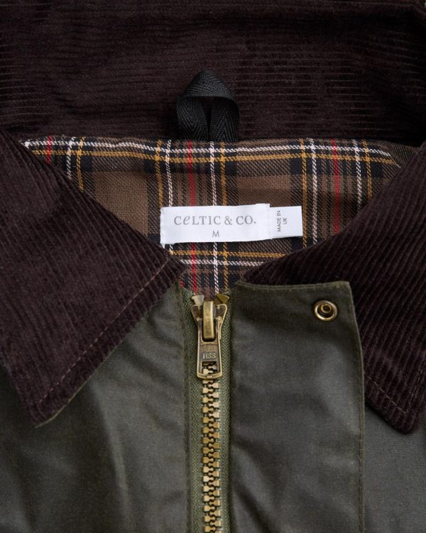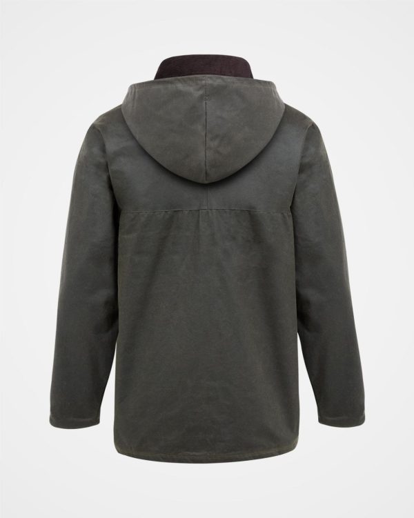 This jacket features a collared neckline, corduroy contrast trim, and a removable hood. The waxed cotton outer provides durability and weather resistance, making it a practical choice for outdoor wear.