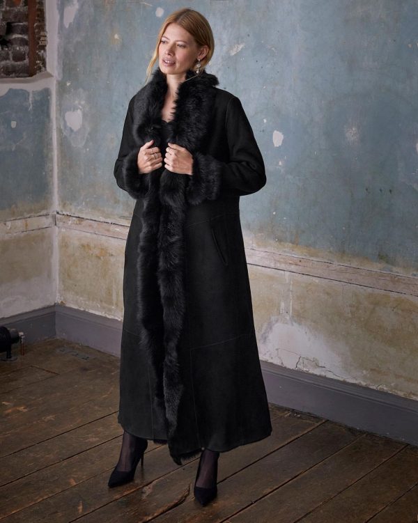 Our latest full-length toscana coat boasts a collared neckline and is crafted with shorter merino sheepskin for the body and sleeves. Long toscana sheepskin trim adorns the collar and cuffs, offering a distinctive touch and statement look. It features a hook and eye fastening and convenient side pockets.