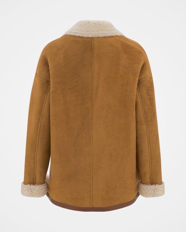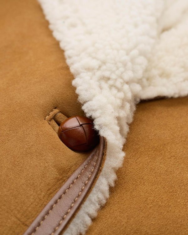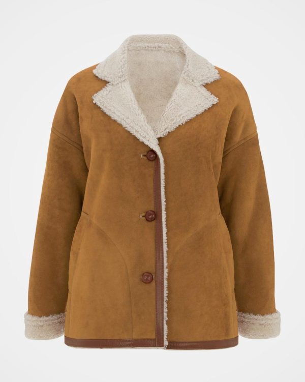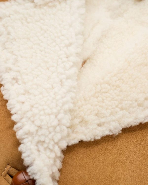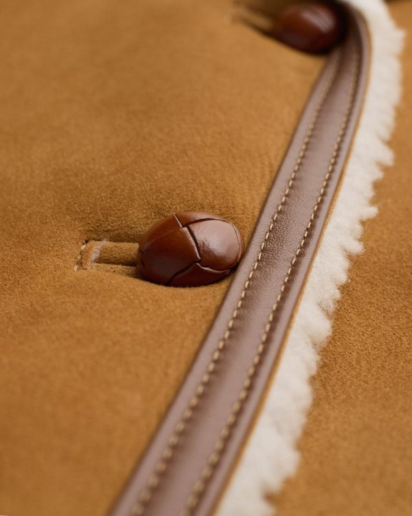 Featuring distinctive football buttons down the front, this premium jacket is crafted from exceptionally soft sheepskin with contrasting cream fleece lining. The cozy fleece appears at the collar and cuffs, while the boxy fit allows easy layering over your favorite outfits.