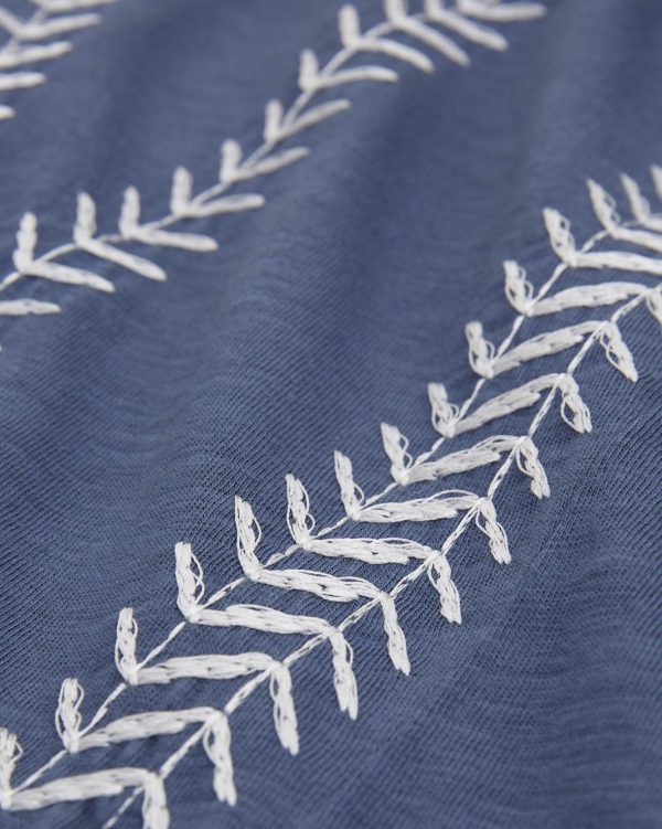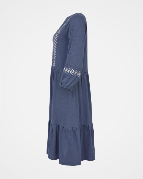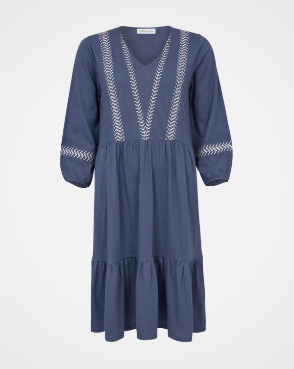 Discover your new favorite summer essential with this knee-length jersey dress that combines effortless style with everyday comfort. The contemporary double-tiered skirt creates beautiful movement while the flattering V-neckline and convenient side pockets add both style and functionality. Designed with a slightly relaxed fit that gracefully skims your silhouette, the eye-catching contrast ivory embroidery across the bodice and sleeves delivers artisan-inspired elegance.