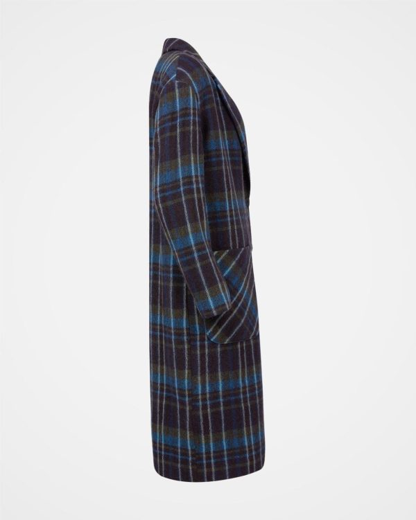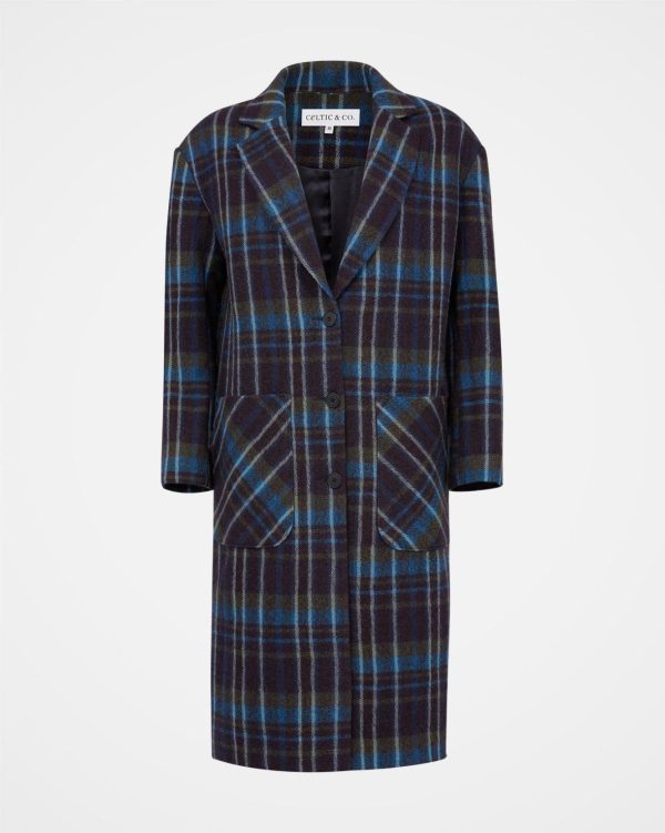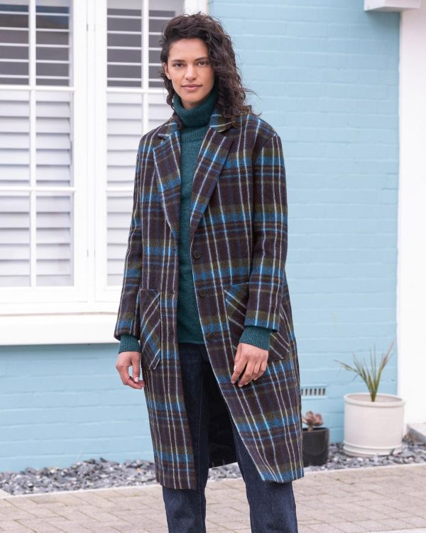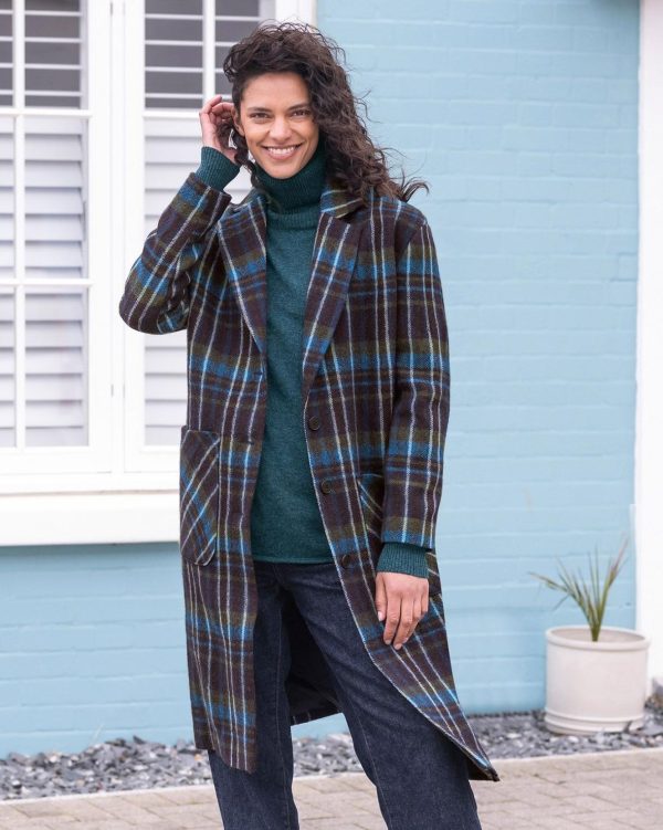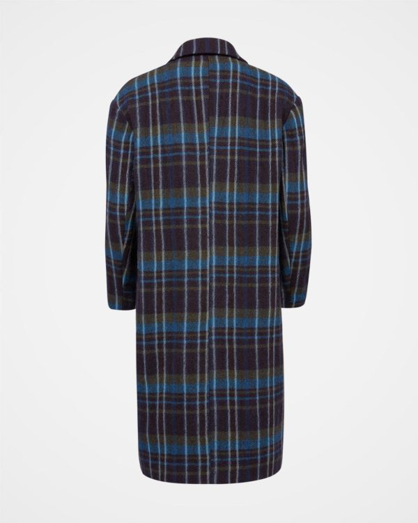 Crafted from premium yarn-dyed woven wool in a timeless overcoat silhouette, this knee-length check coat delivers exceptional warmth and style for the colder seasons. The sophisticated design features a convertible collar that transitions to an elegant V-neckline, complemented by spacious patch pockets to keep your essentials secure and hands cozy. Layer effortlessly over your favorite sweaters and jeans for a polished yet relaxed everyday look.